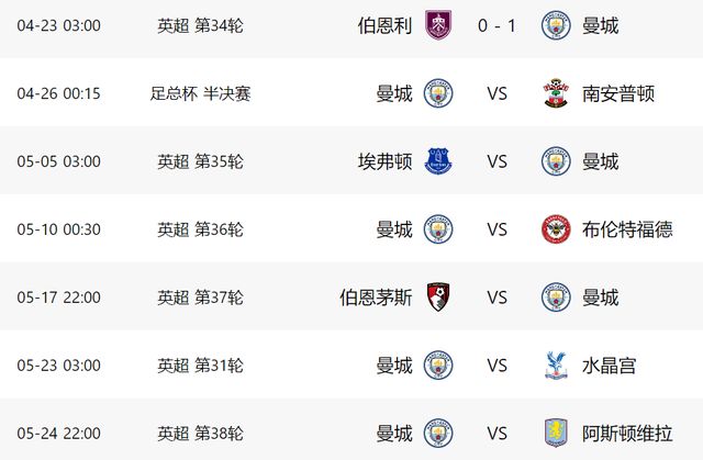 根据赛程安排,曼城最后5场比赛,除了水晶宫之外,其他4个对手都是目前排名前十的强队,他们分别是埃弗顿、布伦特福德、伯恩茅斯和维拉,这些球队都不好对付。值得一提的是,曼城对阵水晶宫和维拉两场比赛,中间相隔不到48小时,对曼城的体能将是一大考验。一旦这些比赛丢分,曼城随时可能丢冠。